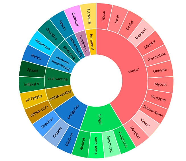 LNP在藥物遞送中的最大單一應用是癌癥治療,這是因為LNP封裝的抗腫瘤藥物比游離藥物具有更高的生物利用度和選擇性。基于脂質的納米載體可降低抗癌藥物對正常組織的毒性,增加疏水性藥物的水溶性,延長藥物停留時間,改善對藥物釋放的控制。第二大類脂質體藥物是殺真菌劑。目前最受關注的脂質體藥物無疑是核酸類脂質體藥物,LNP載體是遞送核酸藥物的成功方法之一。核酸藥物 Patisiran (ONPATTRO),一種在LNP負載的siRNA藥物,可減少肝臟中轉甲狀腺素蛋白的形成,最近獲得FDA批準用于治療遺傳性轉甲狀腺素蛋白介導的淀粉樣變性。它是最早獲批的siRNA藥物和LNP制劑核酸藥物,被視作核酸療法發展的重要里程碑。